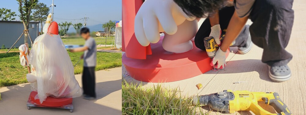 도색 작업이 마무리된 캐릭터 조형물은 클리어를 도포해 주었습니다. 도포한 클리어가 건조가 되면 꼼꼼하게 포장을 한 뒤 설치 장소로 운송을 진행해 주었습니다. 설치 장소로 이동된 꾸리 조형물은 설치 위치를 확인한 뒤 하단 기단에 추가로 제작해 준 화스너와 앙카 볼트를 사용하여 흔들리지 않도록 바닥과 단단하게 고정 작업을 진행해 주었습니다.