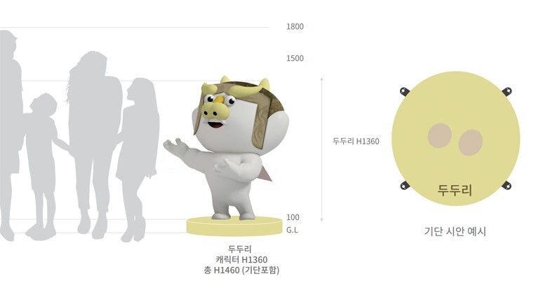 두두리 캐릭터 조형물 디자인 시안 작업을 먼저 진행해 주었습니다. 두두리 디자인 시안은 클라이언트께서 전달해 주셔서 저희는 FRP 조형물의 비율, 크기 등 간단한 디자인 작업을 진행해 드렸습니다. 별도로 디자인 시안을 가지고 있지 않으셔도 원하시는 캐릭터 조형물 관련 사용 목적, 사용 기간 등 레퍼런스를 전달해 주시면 별도 비용 추가와 함께 2D와 3D 디자인 시안 작업을 진행해 드리고 있습니다.