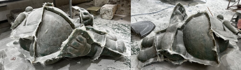 원형 조각이 마무리된 FRP 조형물은 클라이언트의 검수 과정을 마치고 몰드 제작을 위해 규산을 도포해 주었습니다. 규산은 몰드 제작 과정에서 발생하는 화학반응으로 인항 캐릭터 조형물 원형 조각의 파손 및 형태 변형을 방지해 주는 역할을 하고 있습니다. 몰드 내부 표면을 다듬고 성형체 적층을 진행해 주었습니다. 조형물 내부에 각 파이프를 삽입하여 내구성을 높여주고 하단 FRP 기단과 단단하게 결합 작업을 진행해 주었습니다.