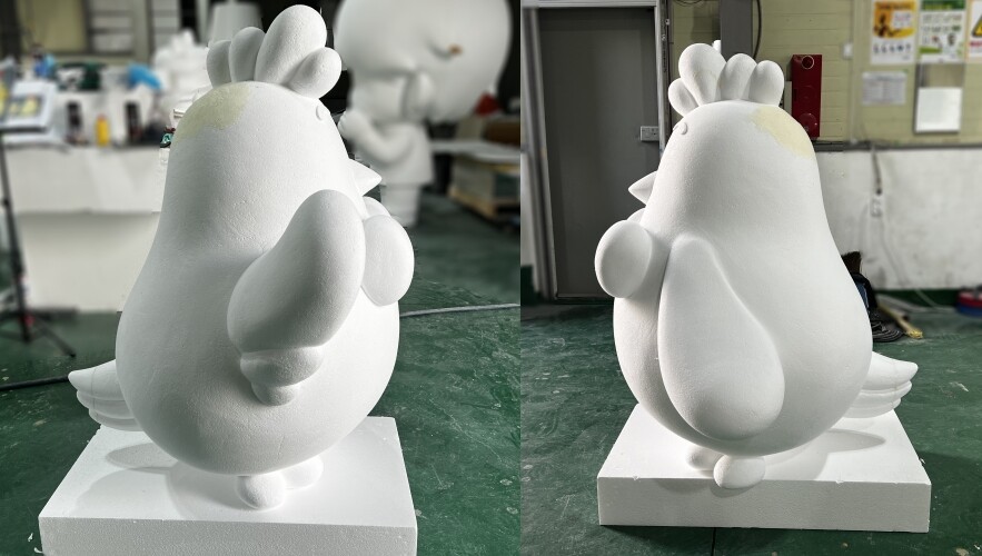 결합 작업이 완료된 간판 조형물은 프라이머를 도포해 주었습니다. 프라이머는 캐릭터 조형물 도장면과 도료 간 접착력을 높여주고 색이 선명하게 발색이 될 수 있도록 하는 역할을 하고 있습니다. 프라이머가 완전히 건조된 야외 조형물은 도색 작업을 진행해 주었습니다. 노랑이 조형물의 벼슬, 리본, 볼 등의 디태일한 부분들은 시트지와 마스킹 작업을 통해 깔끔하게 표현해 주었습니다.
