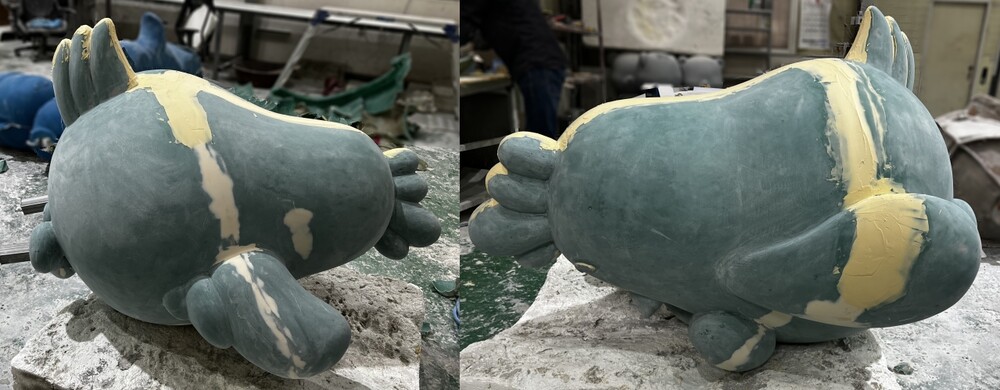 원형 조각이 마무리된 FRP 조형물은 몰드 제작을 진행해 주었습니다. 제작된 몰드 내부 연마 작업을 진행해 주고 FRP를 적층하여 성형체 제작을 진행해 주었습니다. 성형체 적층 과정에서 제거되지 못한 기포와 요철 등을 사포나 샌딩기 등을 사용하여 매끄러운 표면으로 연마 작업을 진행해 주었습니다. 연마 작업이 마무리된 캐릭터 조형물은 분할하여 제작해 둔 하단 계단식 기단과 결합 작업을 진행해 주었습니다.