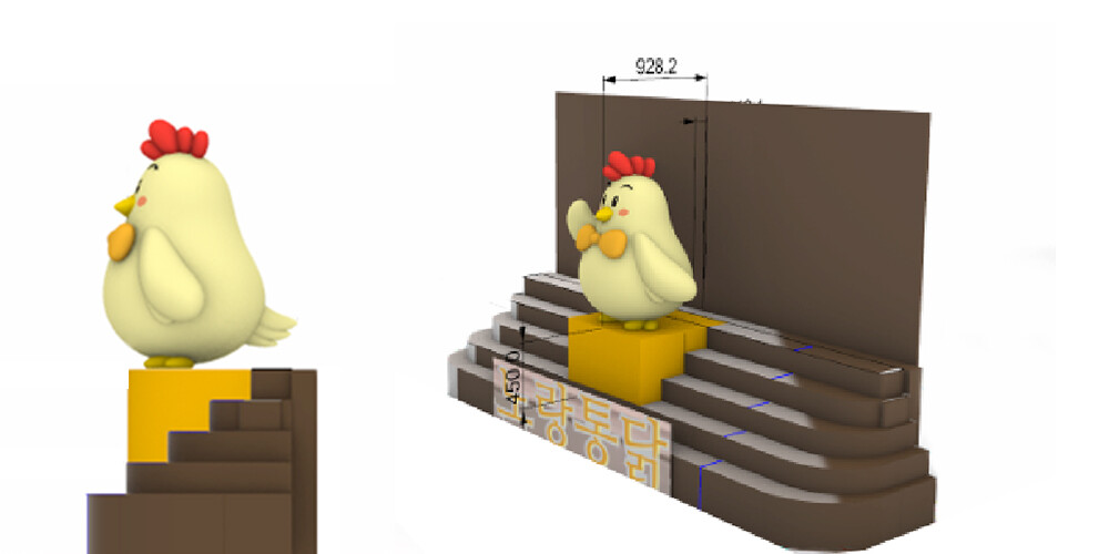 먼저 야외 조형물 디자인 시안 작업을 진행해 주었습니다. 건물 입구에 설치가 될 예정이라 사전에 현장 방문을 통해 실측을 진행해 주었습니다. 실측한 수치를 바탕으로 형상을 정확하게 확인해 주었습니다. 부피 대비 조형물에 바닥에 닿는 면적이 적어 하단 기단을 추가해 주었으며, 설치 위치를 고려하여 계단 형태의 기단으로 제작해 주었습니다.