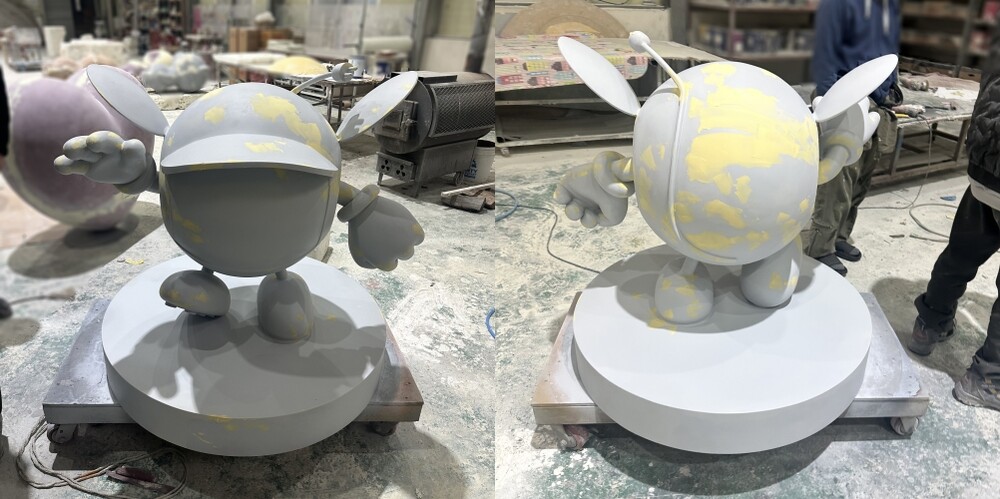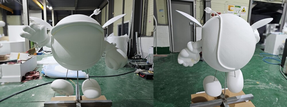 규산이 완전히 건조된 FRP 조형물은 몰드를 제작해 주었습니다. 조형물의 손, 발, 머리 등 디테일한 부분들은 분할하여 제작을 진행해 주었습니다. 조형물 규산 작업을 진행시 캐릭터 조형물 중앙에 얇은 필름지를 추가하여 몰드 제작 이후 원활하게 분리될 수 있도록 작업해 주었습니다. 조형물 후면에는 점검구를 추가하여 금속 파이프를 넣어 내구성을 높여주고 기단과 단단하게 결합이 될 수 있도록 진행해 주었습니다.