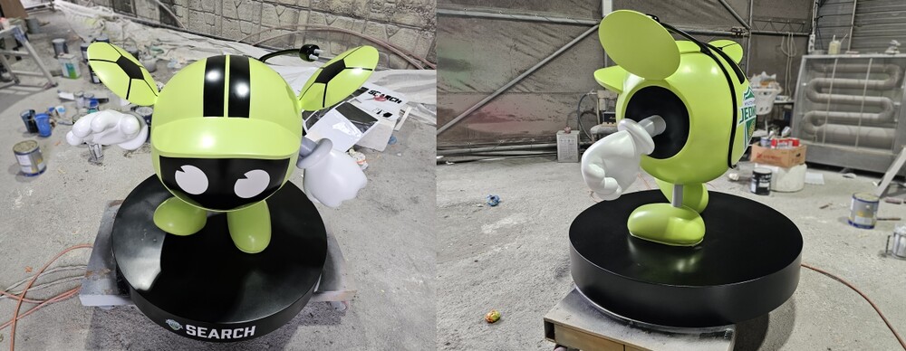 제작이 완료된 몰드 내부 표면은 매끄럽게 다듬어 성형체 적층을 해주었습니다. 이 과정에서 생기는 기포와 요철은 사포나 샌딩기 등으로 매끄러운 표면으로 만들어주었습니다. 캐릭터 조형물 꼬리 부분은 콘센트로 표현이 되기 때문에 줄은 몸에 붙어 돌출되는 형태로 제작하였고 상단부분은 파이프를 넣어 제작해 드렸습니다. 써치 조형물의 오른쪽 발 부분은 공을 차고 있는듯한 모습이 표현이 돼서 바닥에 닿는 면적이 적어 하단에 기단을 추가하였습니다.