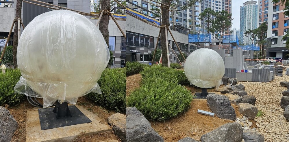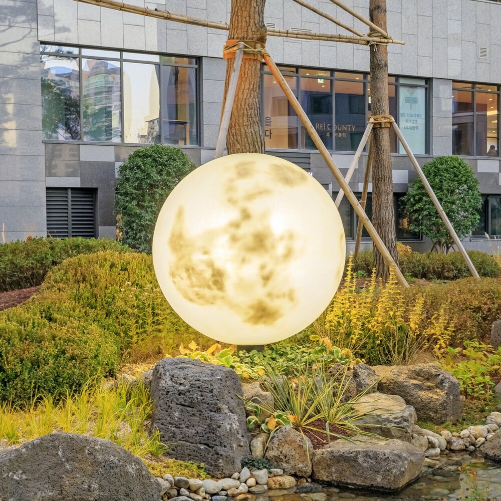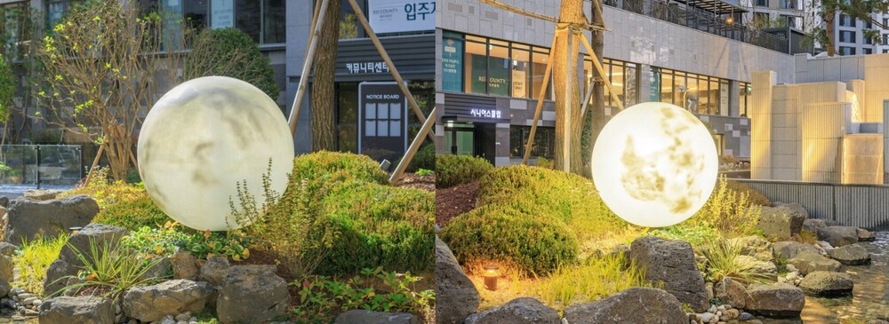 아파트 단지 내 공원에 설치된 이 조형물은 낮에는 은은한 텍스처의 달 형태를, 밤에는 따뜻한 조명으로 보름달처럼 빛나는 감성 포인트입니다.