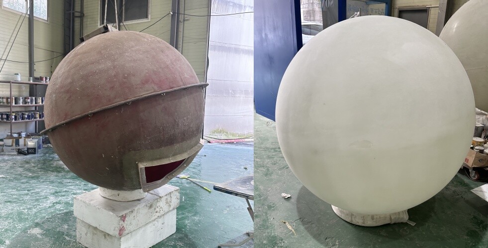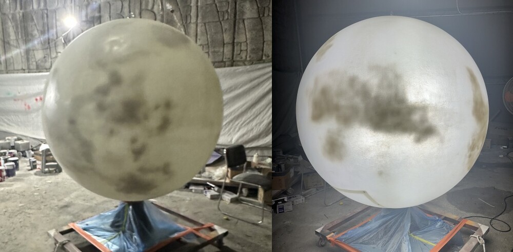 실외에 설치되는 조형물의 제작은 원형 조각부터 시작됩니다. 이번 보름달 모양의 조형물은 부드러운 곡선을 빠르게 구현하기 위해 스티로폼을 컴퓨터 조각기로 정밀하게 가공했습니다. 원형 조각이 완성되면 그 위에 규산을 발라 몰드를 제작을 준비해 주었습니다. FRP 조형물은 몰드 분리를 원활하게 하기 위해 중심부에 얇은 필름층을 덧대는 처리를 함께 진행합니다. 또한, 조형물 내부에 조명을 넣을 예정이었기 때문에 후면에는 점검구를 따로 제작해 유지보수까지 고려했습니다. 보름달 조형물이 서 있을 수 있도록 전선을 숨기고 하중을 지탱하는 지지 기둥도 함께 제작해 주었습니다.