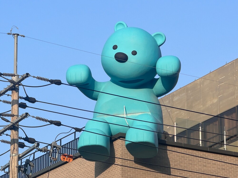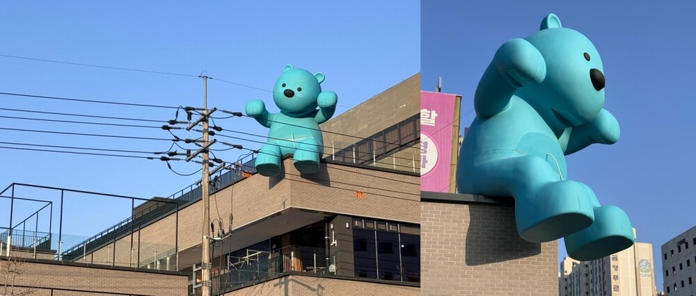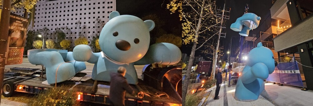 이렇게 설치 작업까지 마무리된 조형물은 최종 클라이언트의 검수 과정을 마친 뒤 시너지타워 야외 건물 대형 곰 캐릭터 FRP 조형물 프로젝트를 마무리해 주었습니다.