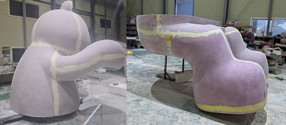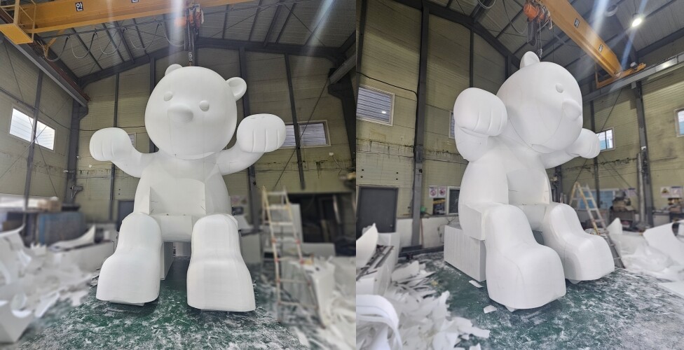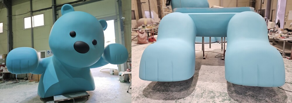 디자인 시안 작업이 마무리되면 조형물의 원형 조각 작업을 진행해 주었습니다. 다자인 시안과 동일한 형태로 제작이 되어야 하기 때문에 밀도가 높고 단단한 스티로폼을 사용하여 제작해 주었습니다. 곰 캐릭터 조형물 같은 경우 초대형 사이즈로 높이 6000mm이기 때문에 상체와 하체로 분할하여 진행해 주었습니다. 원형 조각이 완성되면 규산을 도포하여 다음 작업을 준비해 주었습니다.