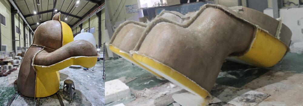 몰드에서 제작된 성형체는 제작 과정에서 발생하는 제거되지 못한 기포와 요철은 다소 거친 표면을 띄고 있습니다. 이러한 부분들은 사포나 샌딩기 등을 사용하여 조형물의 날카로운 부분들이 없이 매끄러운 표면으로 만들어주었습니다. 조형물 내부에는 각 파이프를 함침하여 조형물의 내구성을 높여주었습니다. 연마 작업이 완료된 조형물은 프라이머를 도포하여 다음 작업을 준비해 주었습니다.