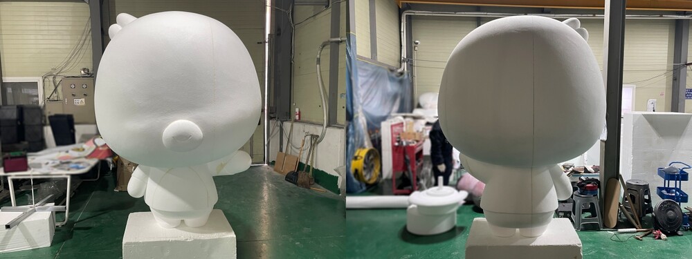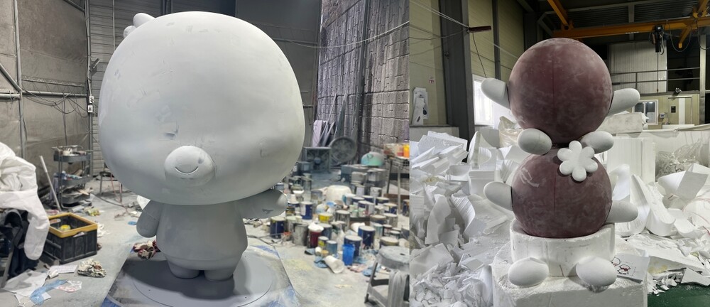디자인 시안이 확정되면 본격적인 야외 조형물 제작을 진행해 주었습니다. 먼저 표현력이 우수란 조각용 스티로폼을 사용하여 조형물의 원형 조각을 진행해 주었습니다. 원형 조각이 완료되면 클라이언트의 검수 과정을 거치고 조형물 중앙에 얇은 필름지를 추가해 준 뒤 규산을 도포해 주었습니다. 규산은 몰드 제작 시 화학 반응으로 인해 조형물의 형태가 변하지 않도록 방지하는 역할을 하고 있습니다.
