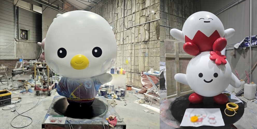 이번 캐릭터 조형물의 디자인 시안은 클라이언트께서 전달해 주셔서 저희 헤파이스토스웍스에서는 조형물의 표정, 동작, 배치 등을 수정해 드렸으며 소재와 제작 방식 등을 안내해 드렸습니다. 포토존 조형물은 부피에 비해 바닥에 닿는 면적이 좁아 안정성을 위해 하단 원형 금속 플레이트 기단을 추가해 주었습니다. 하단 기단은 FRP 조형물은 흔들리거나 넘어지지 않도록 하는 지지 역할을 하고 있습니다.