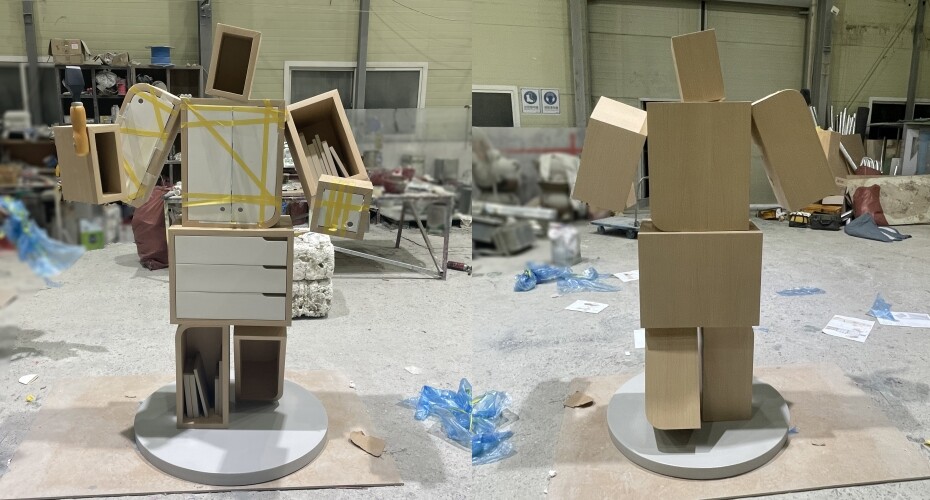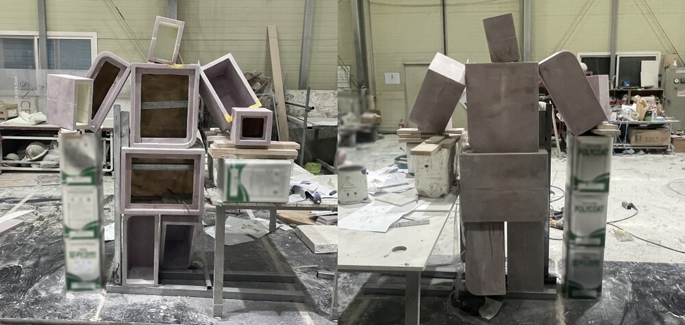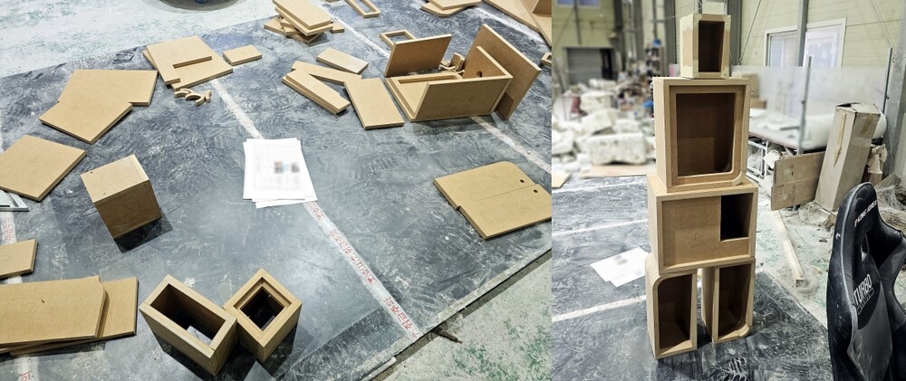 몰드는 일회용 몰드와 다회용 몰드로 나누어지는데요. 이번 전시 조형물에는 똑같은 형태의 요소들이 있어 다회용 몰드를 상용해 주었습니다. 제작된 몰드 내부 표면을 다듬고 성형체 제작을 진행해 주고 사포, 그라인더 등을 사용하여 2~3면 연마 작업을 진행해 주었습니다. 연마 작업이 완료된 현대리바트 조형물은 디자인 시안과 동일한 형태로 결합 작업을 진행해 주고 자세를 고정해 주기 위해 파이프를 사용하여 내부 골조를 제작해 주었습니다.
