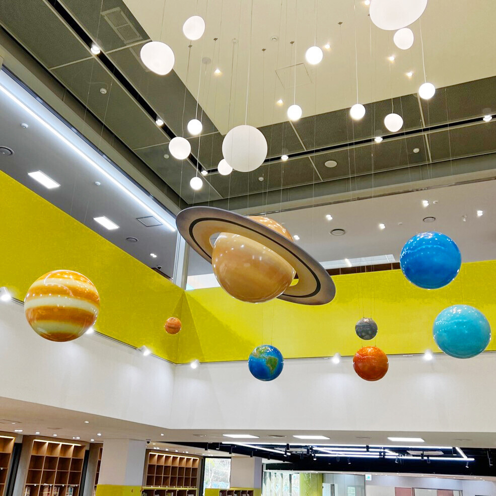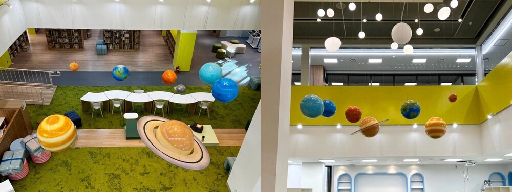 특히 천장에 설치된 행성 조형물은 실내 공간을 입체적으로 활용하며, 마치 우주를 여행하는 듯한 몰입감을 제공합니다.