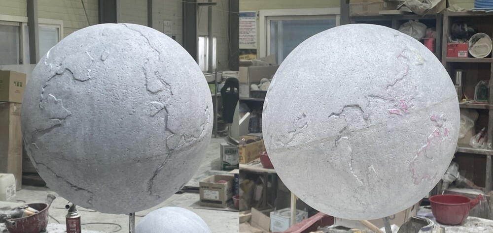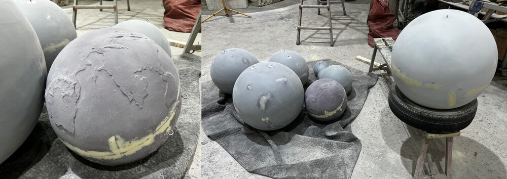 검수가 완료된 입체 조형물은 먼저 몰드를 제작하고, 몰드의 내부 표면을 정밀하게 정리한 후 FRP를 적층하여 성형체를 만들어냈습니다. 성형체가 완성된 후에는 표면 처리 작업이 즉시 시작되는데요. 먼저 연마 과정을 통해 FRP 표면의 거칠거나 미세한 구멍들을 제거하여 매끄럽게 만듭니다. 그다음 프라이머를 적용하여 행성 모형 조형물의 도색 준비를 완료하게 됩니다.