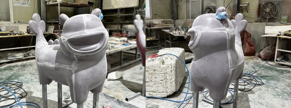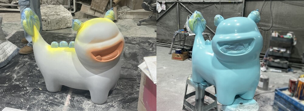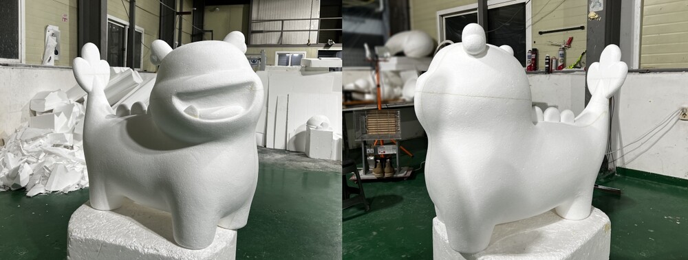 디자인 시안이 최종 확정되면 원형 조각 작업으로 넘어가 주었습니다. 이번 댕댕청룡 조형물은 곡선이 강조된 외형이 특징으로 그 섬세함을 살리기 위해 단단하고 조밀한 조각요 스티로폼을 활용하여 원형 조각을 진행해 주었습니다. 몰드 제작 시에는 화학 반응과 열 발생으로 인해 조형의 원형이 손상될 위험이 있기 때문에 표면에 규산 성분을 덧발라 보호층을 형성해 변형을 방지해 주었습니다.