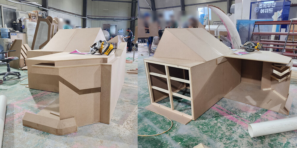결합 작업을 진행해줄때에는 목재 조각들의 이음새가 잘 맞물리고 깔끔하게 제작이 될 수 있도록 신경 써서 작업을 진행하였습니다. 하우징 조형물 내부에 기기가 들어살 수 있도록 각 파이프를 사용하여 뼈대를 만들어주었으며, 내부 기기 삽입 부분의 영역을 침범하지 않도록 판재에 각 파이프를 덧대어 부착하는 방식으로 내부 보강 작업을 진행하였습니다.
