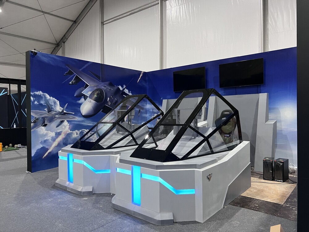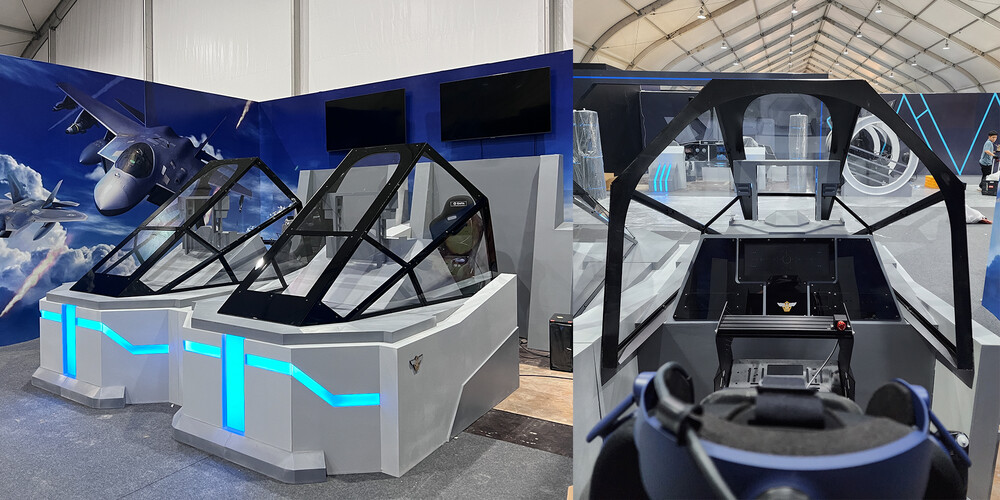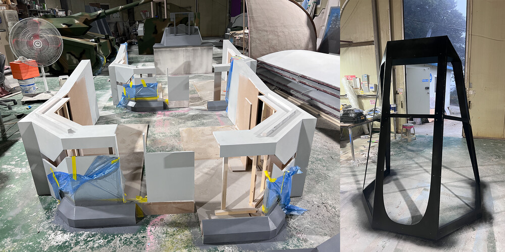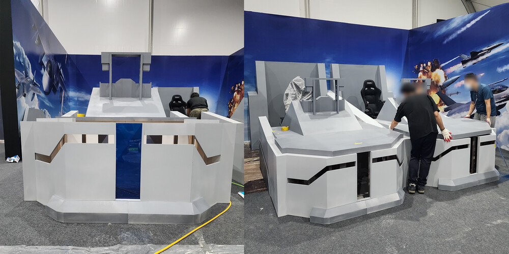 제작이 완료된 전투기 조형물은 안전한 운송을 위해 현장 입고 시 문제가 없는 사이즈로 분할하여 운송을 진행해 주었습니다. 전시 장소인 계룡시 엑스포에 도착한 조형물은 내부에 VR기기를 삽입하고 조명이 함께 설치될 것을 고려하여 주변에 전기 연결이 가능한지, 사람들이 지나가면서 다치지 않도록 전선 위치 등을 체크해주었습니다. 전투기 조형물의 전면에는 실제 잠수함에서 운전하는 것처럼 연출하기 위해 잠수함 조종석의 화면을 표현해 주었습니다. 또한 아크릴, 기성 버튼 등의 디테일한 부분을 표현하여 현장감을 더 높여주었습니다.