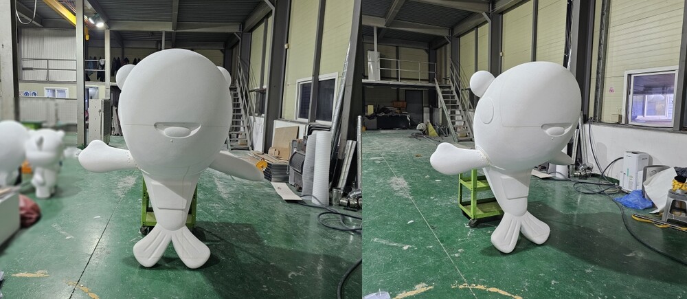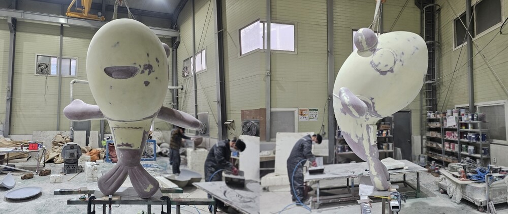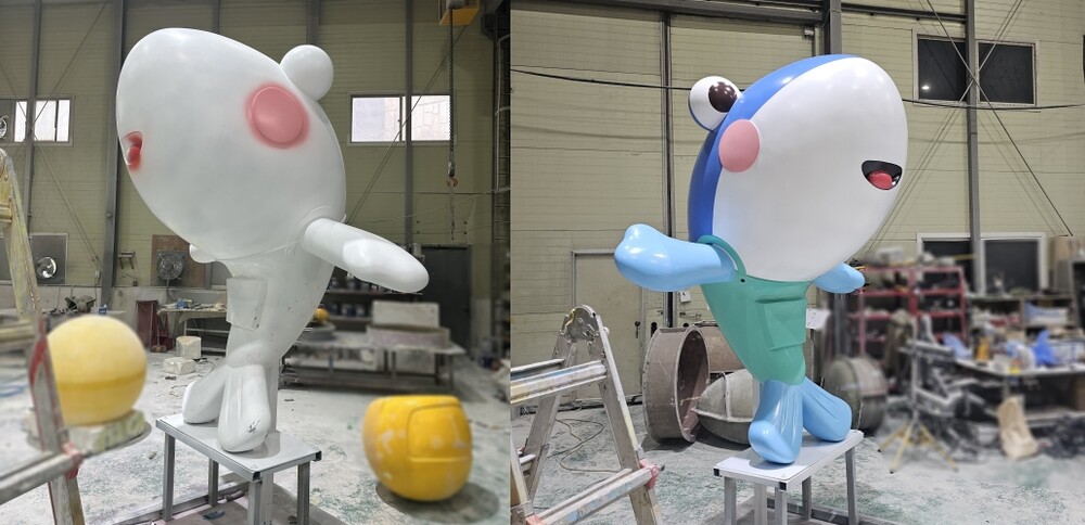 수산시장 조형물 연마 작업 및 결합 작업이 완료가 되면 프라이머를 도포하여 도색 작업을 준비해 주었습니다. 조형물 색상은 사전에 클라이언트와 논의가 되었던 팬톤 색상으로 도색해 주었습니다. 조형물의 눈, 볼, 입 등의 부분은 시트지와 마스킹 작업을 통해 디테일은 높여주었습니다. 도색 작업이 완료된 조형물은 클리어를 도포하여 제작을 마무리해 주었습니다.