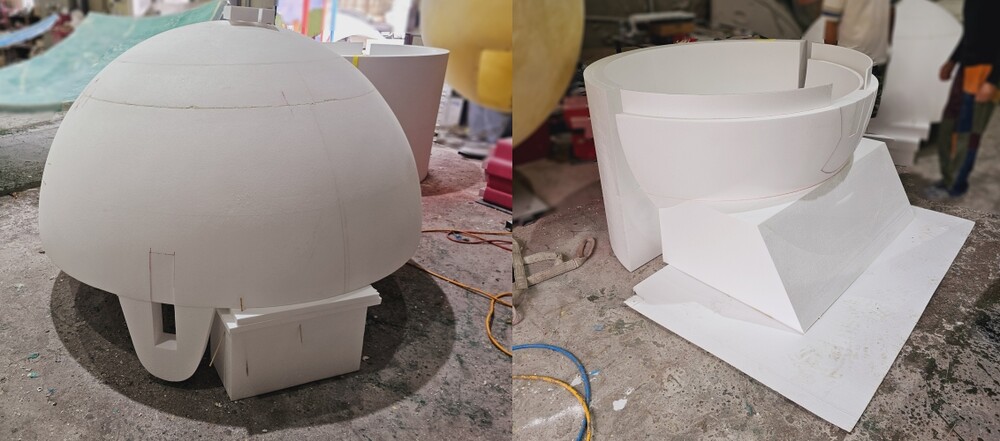 이번 조형물은 둥근 형태를 잘 살려주기 위해 밀도가 높고 입자가 단단한 조각용 스티로폼을 사용하여 정밀하게 원형 조각을 제작해 주었습니다. FRP 조형물 특성상 내부는 비어있고 외부는 단단하기 때문에 조형물 완성 이후 수정이 불가능합니다. 그렇기 때문에 조형물 형태가 확정 나는 원형 조각 단계에서 클라이언트의 검수 과정을 꼭 거친 후 다음 작업을 넘어가고 있습니다.
