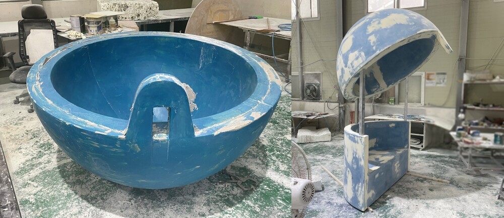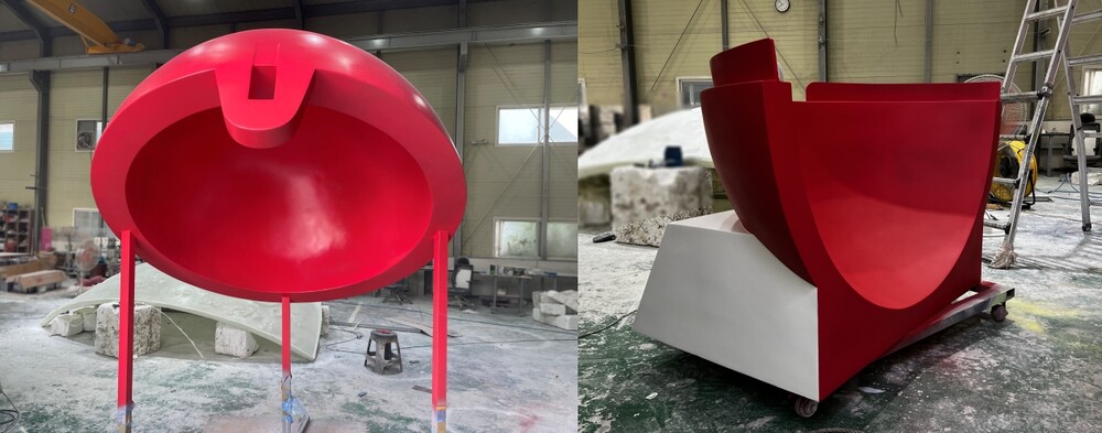 원형 조각이 마무리된 펀엑스포 조형물은 규산을 도포한 뒤 몰드 제작을 진행해 주었습니다. 제작된 몰드 표면을 다듬고 FRP 적층하여 성형체 제작을 진행해 주었습니다. 대형 조형물 하단부와 상단부 연결은 각 파이프를 추가하여 알맞은 높이로 결합 작업을 진행해 주었습니다. 결합 작업이 완료된 캡슐 조형물은 프라이머를 도포해 주었습니다.