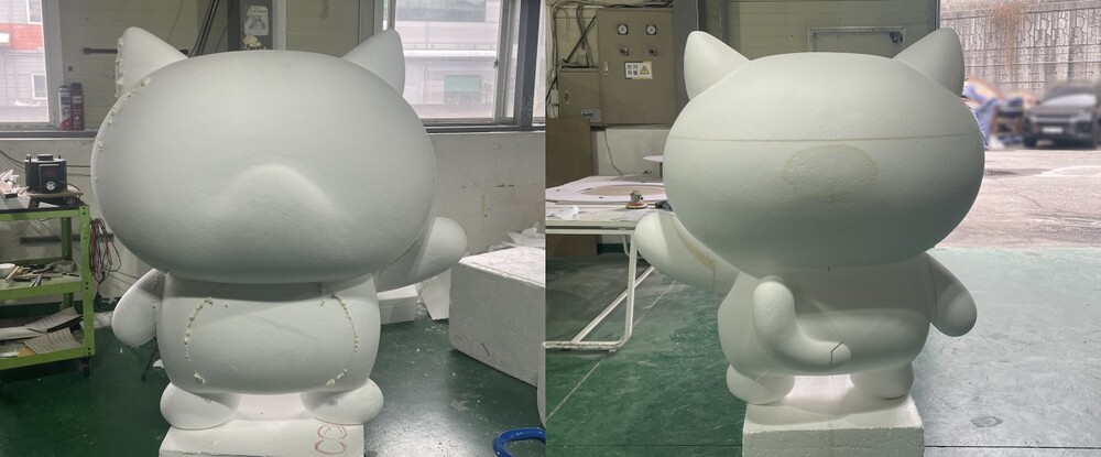 디자인 시안이 최종 확정되면, 불교박람회에 설치될 조형물의 제작이 본격적으로 진행됩니다. 제작의 첫 단계는 고밀도의 전용 스티로폼을 사용해 전체적인 구조를 조각하는 작업을 진행해 주었습니다. 아토 조형물은 내부가 비어 있는 구조로 설계되며, 겉면은 단단하게 마감 처리되기 때문에 한 번 형태가 완성된 이후에는 외형을 수정하기가 매우 어렵습니다. 따라서 조각 초기에 디자인 시안과 최대한 유사한 윤곽을 잡는 것이 무엇보다 중요한 과정입니다.