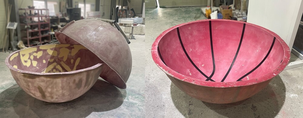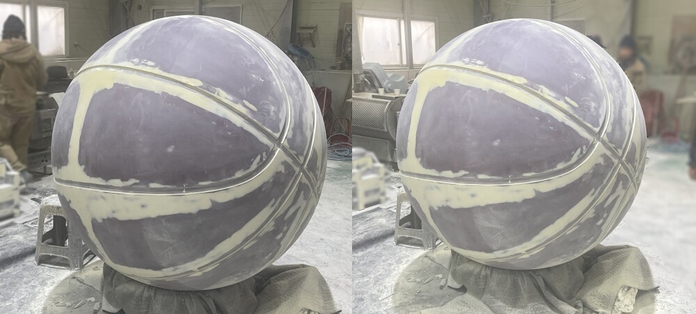 먼저 농구공 조형물의 기본 형상을 조형하는 작업을 진행해 주었습니다. 컴퓨터 기반의 자동 조각 장비를 활용해 정원 형태를 정밀하게 구현했으며 조각 전용 고밀도 스티로폼을 사용해 형태의 세밀한 표현이 가능하도록 해주었습니다. 형상이 완성된 옥상 조형물에는 규산 처리를 통해 이후 몰드 제작이 가능하도록 표면 준비를 마쳤습니다.