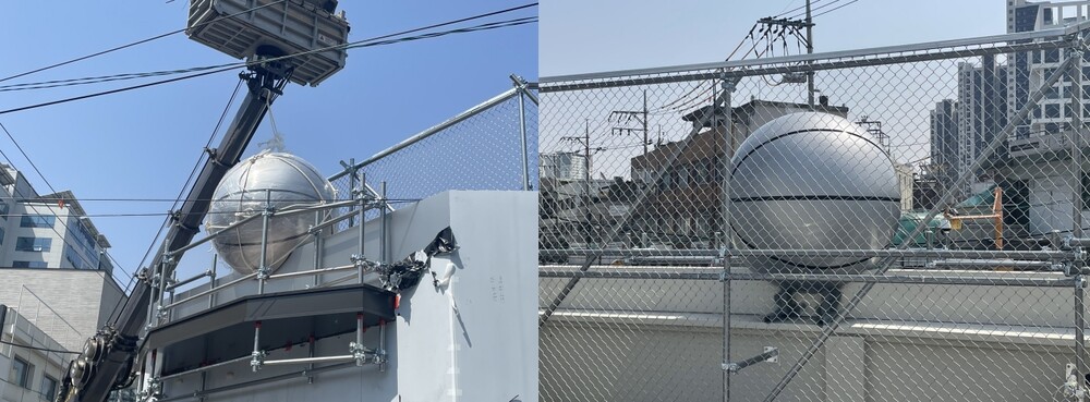농구공 모형 조형물은 설치를 위해 안전하게 현장으로 운송을 진행해 주었습니다. 이번에 제작된 농구공 형상의 FRP 조형물은 1층 매장의 전면 옥상 난간에 부착될 계획이었으며 이를 위해 고소 작업이 가능한 스카이 차량을 활용해 설치를 진행해 주었습니다. 설치에 앞서 사전 설계 단계에서 난간 구조의 실제 치수를 반영해 조형물 하단을 미리 절단해두었으며 현장에서 조형물이 정확히 맞물릴 수 있도록 치수와 형태를 정밀하게 맞춰 제작해 주었습니다. 고정은 옥상 난간의 철제 구조물에 직접 용접하는 방식으로 견고하게 마무리해 주었습니다.