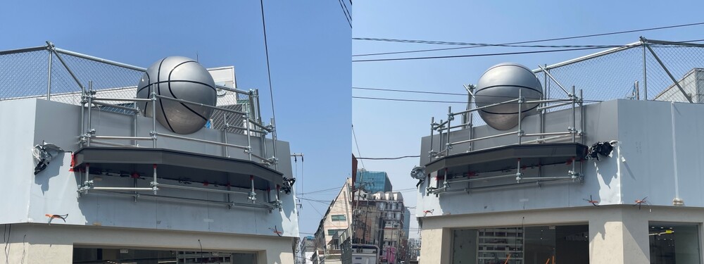 설치가 완료된 이후에는 용접 부위에 방청 처리를 통해 부식 방지를 위한 마감까지 세심하게 진행해 주고 클라이언트의 최종 검수 과정을 끝으로 팝업 매장 옥상 건물 농구공 모형 FRP 간판 조형물 프로젝트를 마무리해 주었습니다.