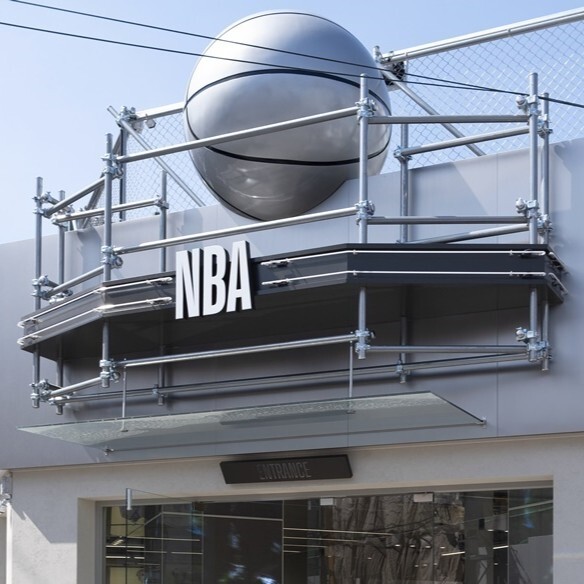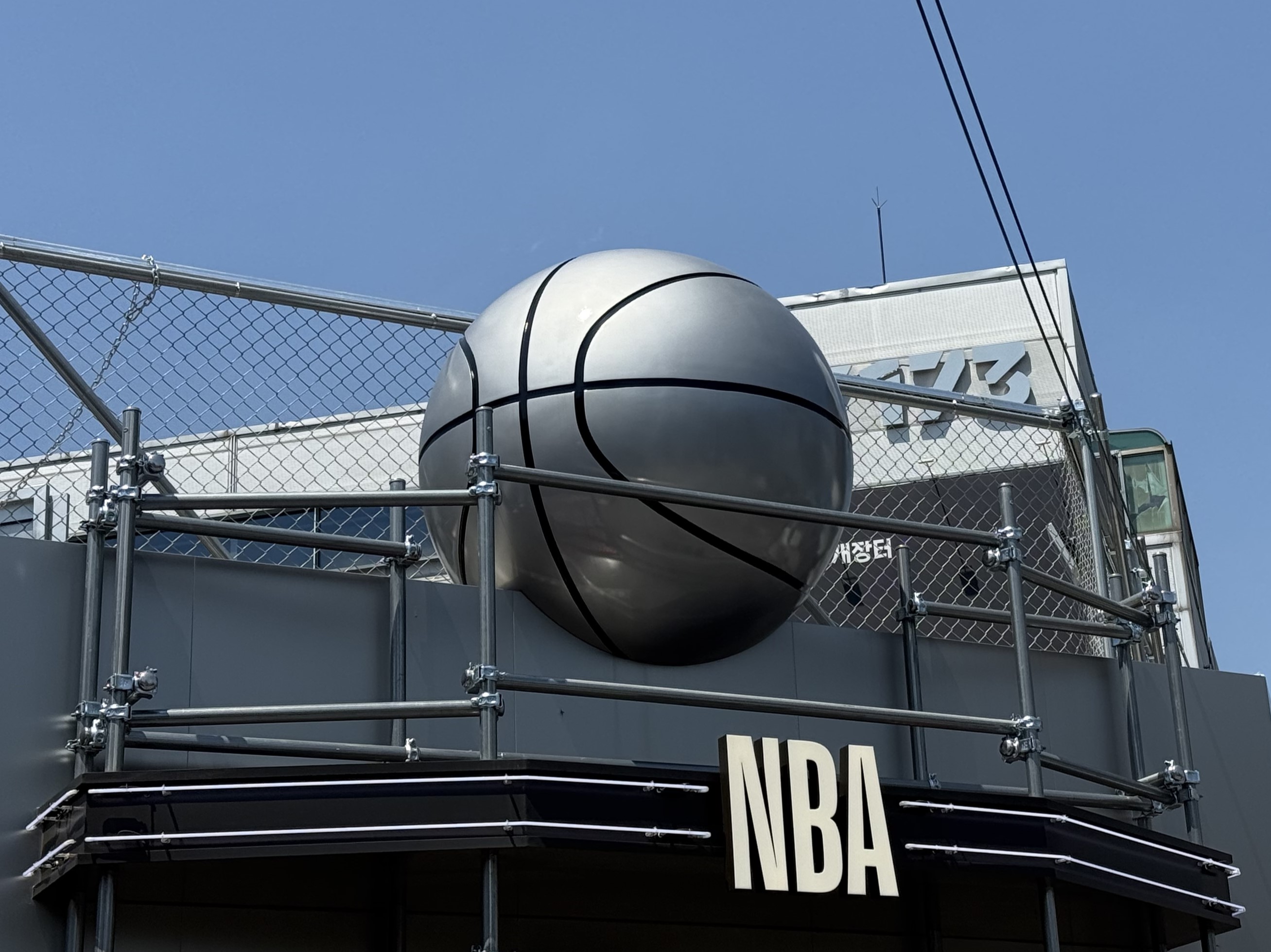 농구공을 콘셉트로 한 상징 조형물로 매장 외벽 상단에 설치되어