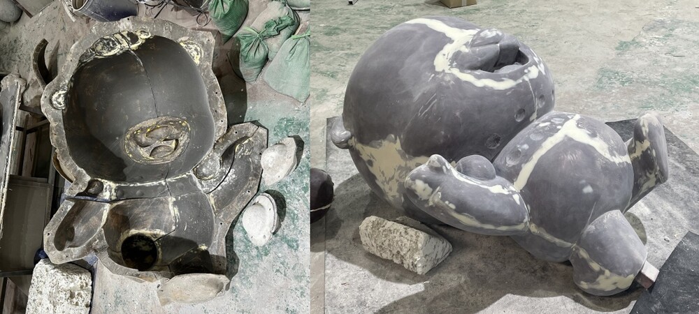 디자인 시안을 바탕으로 조각용 스티로폼을 활용해 원형 조형을 제작합니다. 숙련된 조각가가 측면과 후면 형태를 구현하고 원형 조각 표면에 규산 처리로 몰드를 형성합니다. 목걸이, 꼬리 등은 분할 제작해 정밀도를 높였으며 조형물 내부에는 각파이프를 넣어 내구성을 확보했습니다. 성형체는 적층 후 퍼티, 사포 등으로 표면을 다듬어 주고 연마가 끝나면 각 부위를 시안에 맞춰 결합합니다. 기단 연결 시에는 수평, 수직뿐 아니라 무게중심도 고려해 안정적으로 마무리합니다.