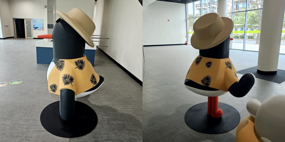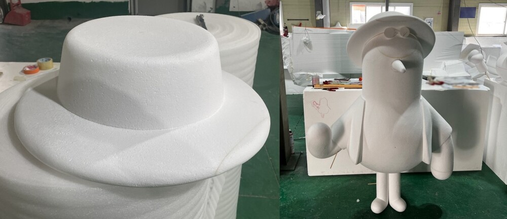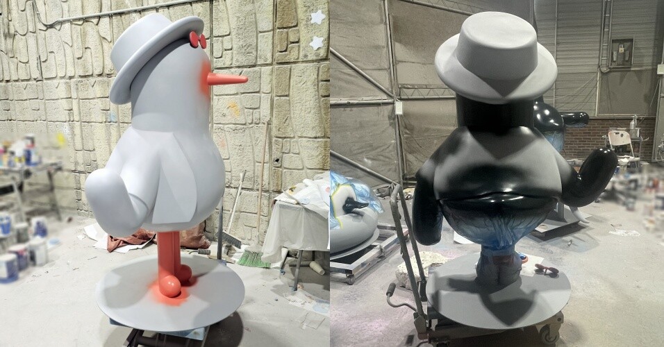 이번 조형물은 캐릭터가 모자와 알로하 셔츠를 착용한 디자인으로 제작되었습니다. 조형물의 기본 틀은 조각용 스티로폼을 활용하여 조각됩니다. 조각 작업이 마무리되고 캐릭터의 세부 요소가 정확하게 반영되었는지 확인된 후에는 몰드 제작을 위해 조형물 전체 표면에 규산을 도포해 줍니다. 이때 규산은 몰드 제작 과정에서 발생하는 화학반응으로 인해 원형 조각이 파손되는 것을 방지하고 있습니다.