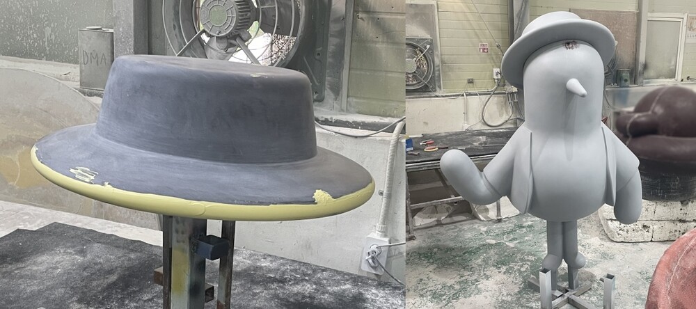 규산이 완전히 마르면 몰드 제작을 진행해 주었습니다. 몰드 내부 표면을 정리하고 FRP를 적층하여 성형체를 제작해 주었습니다. 이 과정에서 기포나 미세한 요철, 균열 등이 일부 남게 되며, 그로 인해 입체 구조물 내부는 다소 불균형하거나 거친 질감이 나타날 수 있습니다. 이러한 결함은 퍼티를 이용해 틈을 메우고 샌딩기와 사포를 활용해 부드럽게 표면을 다듬어주고 분할하여 제작된 모자와 선글라스 부분을 결합시켜 주었습니다.