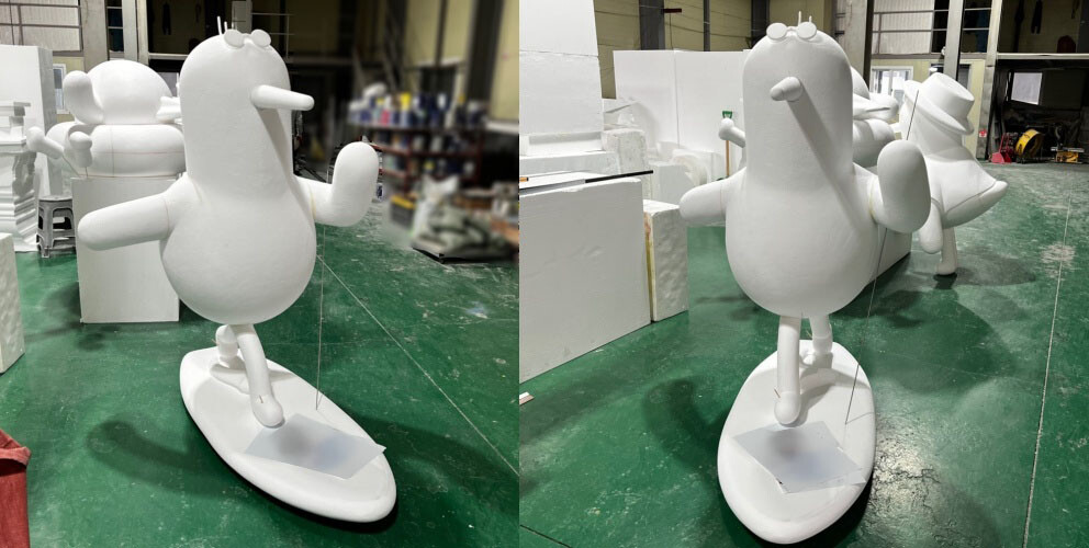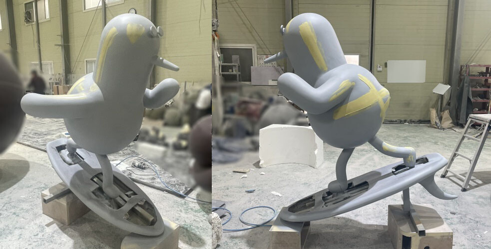 규산이 충분히 경화된 이후에는 조형물의 몰드 제작 단계로 진입했습니다. 보드나 안경처럼 작은 부속 요소들은 개별적으로 분리해 따로 제작해 주었습니다. 몰드 내부의 표면을 정돈한 뒤 FRP를 여러 겹으로 쌓아 올리는 방식으로 본체를 성형했습니다. 조형물은 자체적으로도 튼튼하지만 내부에 금속 파이프를 삽입해 구조적 강도를 한층 더 강화해 주었습니다. 마지막으로 표면 처리를 위해 프라이머를 전체적으로 도포하며 도색 작업을 준비해 주었습니다.