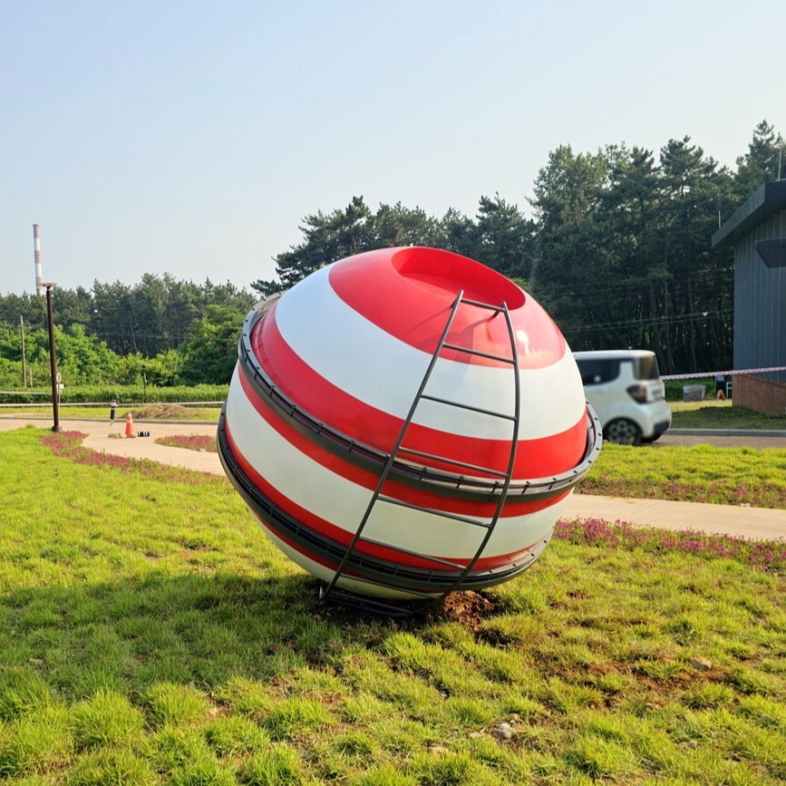 설치 현장으로 안전하게 운송된 조형물은 레인을 이용해 전시 조형물을 공중에 띄운 뒤 정확한 위치에 고정시키는 방식으로 진행되며 하단부에는 금속 기초석을 용접한 후 지면에 단단히 매립해 구조적 안정성을 확보합니다. 고정 작업이 끝난 이후에는 클라이언트의 최종 검수 과정을 끝으로 대형 카페 야외 전시 구 모형 FRP 조형물 프로젝트를 마무리해 주었습니다.