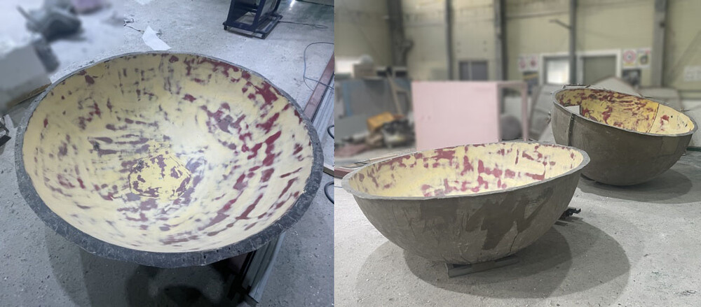 구 형태를 구현하기 위해 컴퓨터 자동 조각 장비를 활용하여 조각용 스티로폼을 정밀하게 가공해 원형을 제작했습니다. 원형 조각이 완료된 전시 조형물 내부 면에 규산 처리를 진행했으며 규산이 충분히 건조된 뒤 몰드 제작 단계에 들어갔습니다. 이 규산은 몰드를 제작할 때 발생하는 열로 인해 원형이 변형되거나 손상되는 것을 방지하는 보호 역할을 합니다.