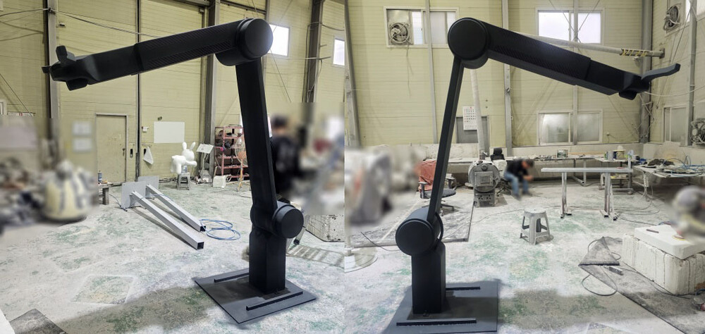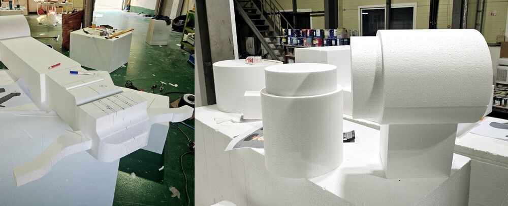 조형물 제작은 먼저 전체 실루엣을 입체적으로 형상화하는 작업부터 출발합니다. 이때 주로 활용되는 재료는 가볍고 가공성이 뛰어난 고밀도 스티로폼으로 넓은 부피를 효율적으로 다룰 수 있어 대형 구조물에 적합합니다.이번 로봇청소기 모형 제작에서도 각지고 기계적인 디자인 특성상, 치밀한 비례 설정과 조인트 구성이 중요했으며 실제 제품과 유사한 구조적 디테일을 구현하는 데 중점을 두었습니다.