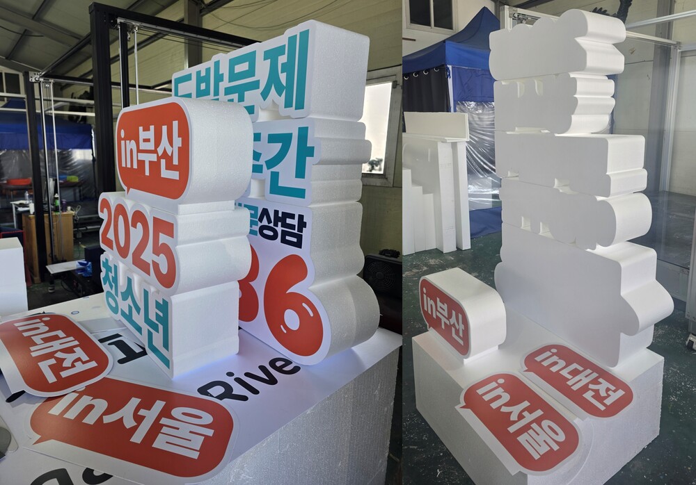 완성된 스티로폼 조형물은 디자인 시안과 전체 구조 및 글자 배치가 일치하는지 클라이언트의 최종 검수 승인 후, 안전하게 운송지까지 운송을 진행해 드렸습니다. 스티로폼 조형물의 경우 운송 중에 파손이 되지 않도록 꼼꼼하게 보양 작업을 진행한 후 운송이 진행되었으며, 해당 운송 장소로 안전하게 운송된 후 스티로폼 홍보 조형물은 각 서울, 대전, 부산 행사마다 2025 청소년 도박 문제 예방 주간 무대 위에 설치되었습니다.