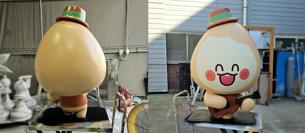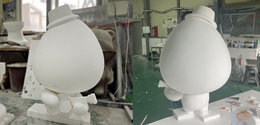 확정된 시안을 바탕으로 실제 제작의 첫 단계인 원형 조각에 들어갔습니다. 고밀도 전용 스티로폼을 사용해 캐릭터의 얼굴, 볼, 악기를 든 손 등 주요 디테일을 손으로 직접 조각하며 갓평이의 특징을 구현했습니다. 단순한 형태 제작을 넘어 디자인 시안의 비율과 표정을 실제 입체로 옮기는 작업이 핵심입니다. 특히 갓과 기타처럼 돌출된 구조물은 강도를 고려해 보강하며 조각하여 최종 형태에 가까운 실루엣을 완성했습니다.