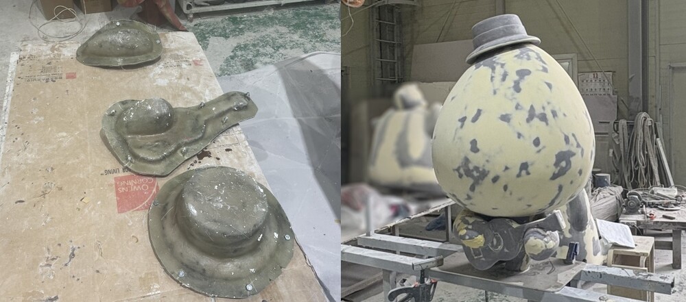 원형 조각이 끝난 후에는 FRP 적층 공정이 진행되었습니다. FRP를 여러 겹 겹쳐 강도를 높이는 방식으로 외부 환경에 직접 노출되는 옥상 조형물의 내구성을 확보하는 핵심 단계입니다. 내부에는 철제 프레임을 삽입하여 구조적 안정성을 높였고 돌출된 부위는 별도 성형 후 접합하여 파손 위험을 최소화했습니다. 적층이 끝난 후에는 퍼티와 샌딩으로 표면을 매끄럽게 다듬고 프라이머를 도포해 도색 준비를 완료했습니다.