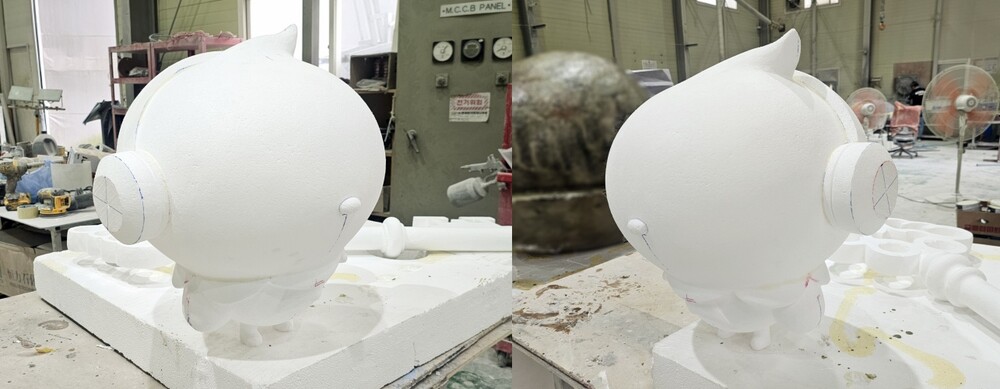최종 결정된 디자인을 바탕으로 입체 조각 작업에 들어갑니다. 원형 조각은 조각용 스티로폼을 사용하며 곡선이 많은 구조도 원안에 가깝게 구현될 수 있도록 숙련된 마스코트 조형물 작가의 노하우를 반영해 정밀하게 조각합니다. FRP 조형물 원형 조각이 마무리되면 표면에 규산을 발라 다음 작업으로 넘어갈 수 있도록 다음 공정을 준비합니다.