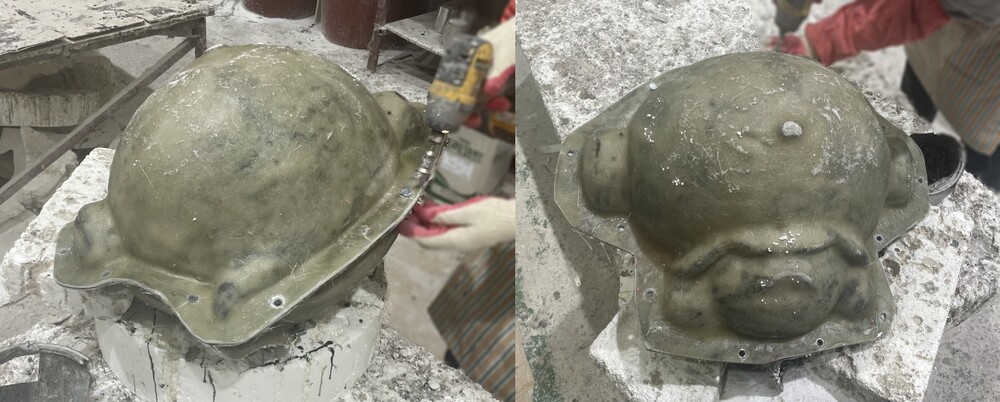 송송이 조형물 표면에 도포된 규산이 충분히 경화되면 이를 기반으로 몰드 형성 작업이 진행됩니다. 제작된 몰드는 내부 구조물인 스티로폼을 제거한 뒤 내부에 남아있는 표면 특유의 입자감이나 미세한 흠집을 줄이기 위해 샌딩 장비를 활용해 세밀하게 표면을 다듬습니다. 이후 다듬어진 몰드 안쪽에 FRP 소재를 여러 겹 겹쳐가며 적층하여 최종 성형체를 제작하게 되며, 이 과정에서 각 층이 고르게 분포되도록 두께를 일정하게 유지하는 것이 중요합니다.