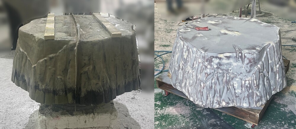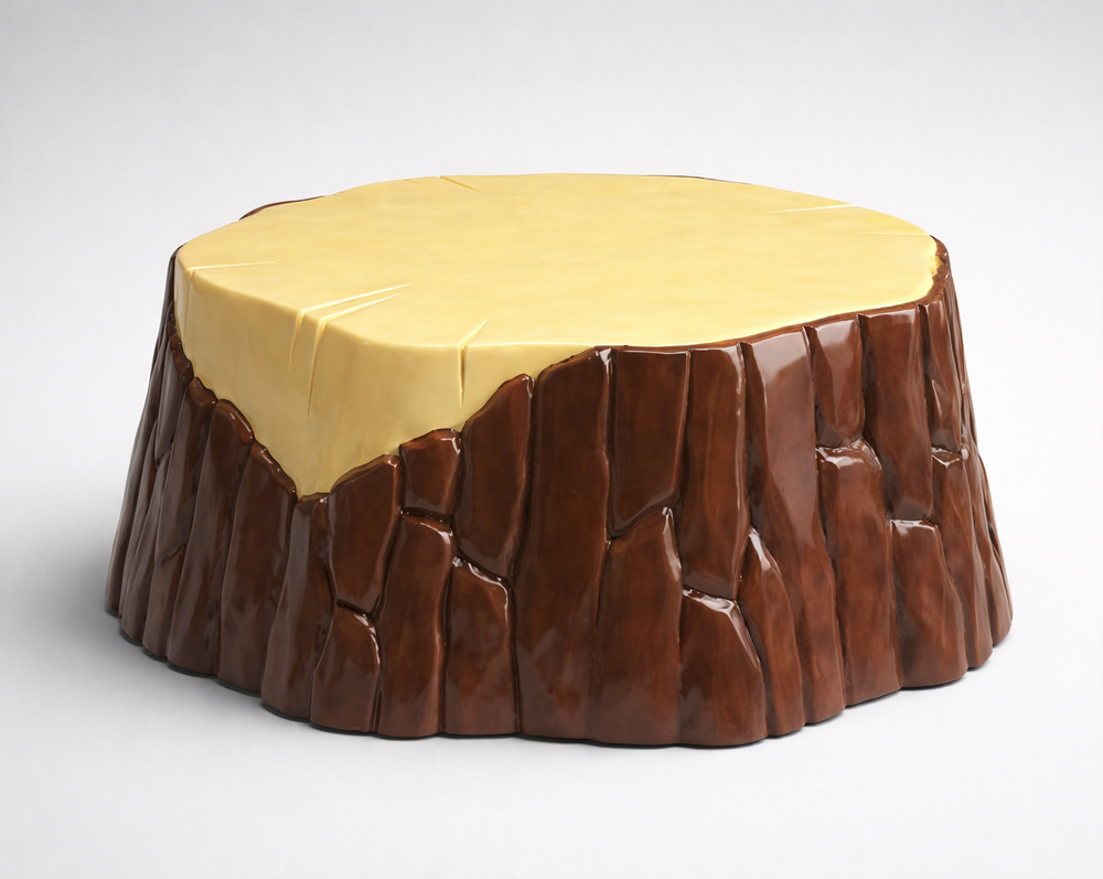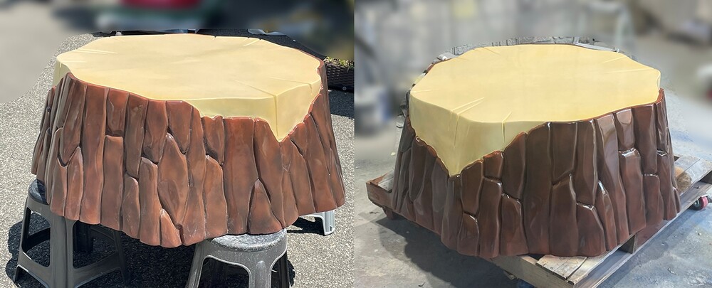성형체 제작이 완료된 이후에는 프라이머를 도포하여 도료의 밀착력을 높이고 색상의 발색을 균일하게 만드는 기초 작업을 진행합니다. 프라이머가 건조되면 테이블 조형물의 도색 단계가 진행되는데, 도료를 사용하여 나무 그루터기 테이블 모형의 자연스러운 질감을 표현하기 위해 다양한 톤의 브라운 컬러를 레이어 방식으로 분사합니다. 여러번 레어링함으로써 도료가 뭉치치 않고 깨끗하게 색감이 안착됩니다. 또한 나무껍질과 나이테 속살부분의 경계를 꼼꼼한 마스킹작업으로 경계면이 깔끔하게 도색될 수 있도록 작업을 진행합니다. 도색이 완료되면 마지막으로 FRP 조형물에 유광 클리어 코팅을 도포하여 오염과 스크래치, 변색에 강한 보호막을 형성하여 FRP 조형물의 완성도를 높여주고 작업을 마무리 합니다.
