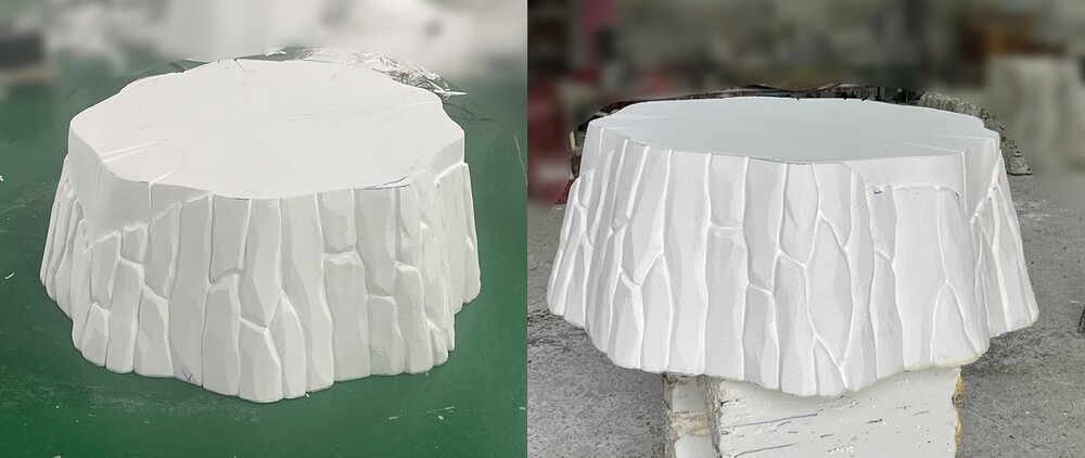 전시 조형물 제작 원형 조각 단계는 전체 FRP 모형의 완성도를 결정짓는 가장 핵심적인 공정입니다. 설계 디자인을 기반으로 스티로폼을 정밀 가공하여 테이블 모형의 기본 형태를 구현하게 되며, 이 과정에서는 나무의 질감과 형태적 특징을 사실적으로 표현하는 데 집중합니다. 특히 그루터기 외부의 거친 껍질 표현과 상판 및 착석 부분의 매끄러운 마감이 동시에 요구되기 때문에, 조형적인 감각과 기능적 요소를 함께 고려한 작업이 이루어집니다. 실내 FRP 조형물은 완성 이후 형태 수정이 어렵기 때문에 이 단계에서의 정밀도 확보가 매우 중요하며, 작은 비율 차이도 전체 공간의 완성도에 영향을 줄 수 있습니다. 또한 아이들이 사용하는 테이블 모형이라는 특성을 반영하여 모서리와 곡면을 자연스럽게 정리하고, 안정적인 구조를 유지할 수 있도록 형태를 다듬습니다. 최종적으로 원형 조각이 완성되면 표면 보호를 위한 처리를 진행하고, 이후 몰드 제작 공정으로 넘어가게 됩니다.