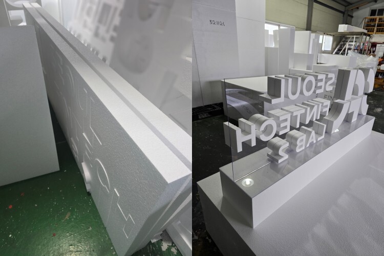 전면부는 흰색 스티로폼 본체 위에 포맥스 판을 부착한 후, 시트지를 통해 텍스트와 로고를 정밀하게 표현하였습니다. 후면은 별도 마감 없이 스티로폼 표면 그대로 유지되며, 전면부만이 강조된 구조로 제작이 된 사례입니다. 중앙에는 투명 아크릴 PC판을 삽입하여 입체감과 내구성을 더한 상태로 로비 공간 스티로폼 조형물이 제작되었습니다.