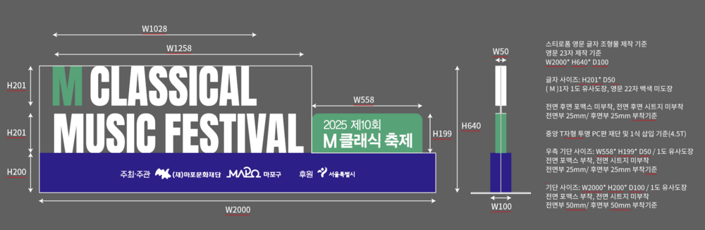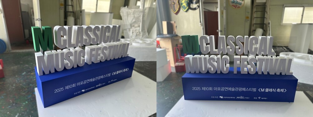 2025년 서울 마포구에서 열린 M 클래식 축제를 위해 제작된 글자 스카시 조형물의 경우, 클라이언트가 제공한 디자인 시안을 바탕으로 초안 작업부터 세부 디자인 확정 단계까지 진행되었습니다. 제작 과정에서는 관련 레퍼런스를 참고하여, 이해하기 쉽도록 시각 자료로 정리하여 클라이언트와 공유하였습니다. 이후 공유된 자료를 기반으로 시안이 확정되면, 야외 설치를 고려한 최종 스카시 조형물 구현이 이루어졌습니다.