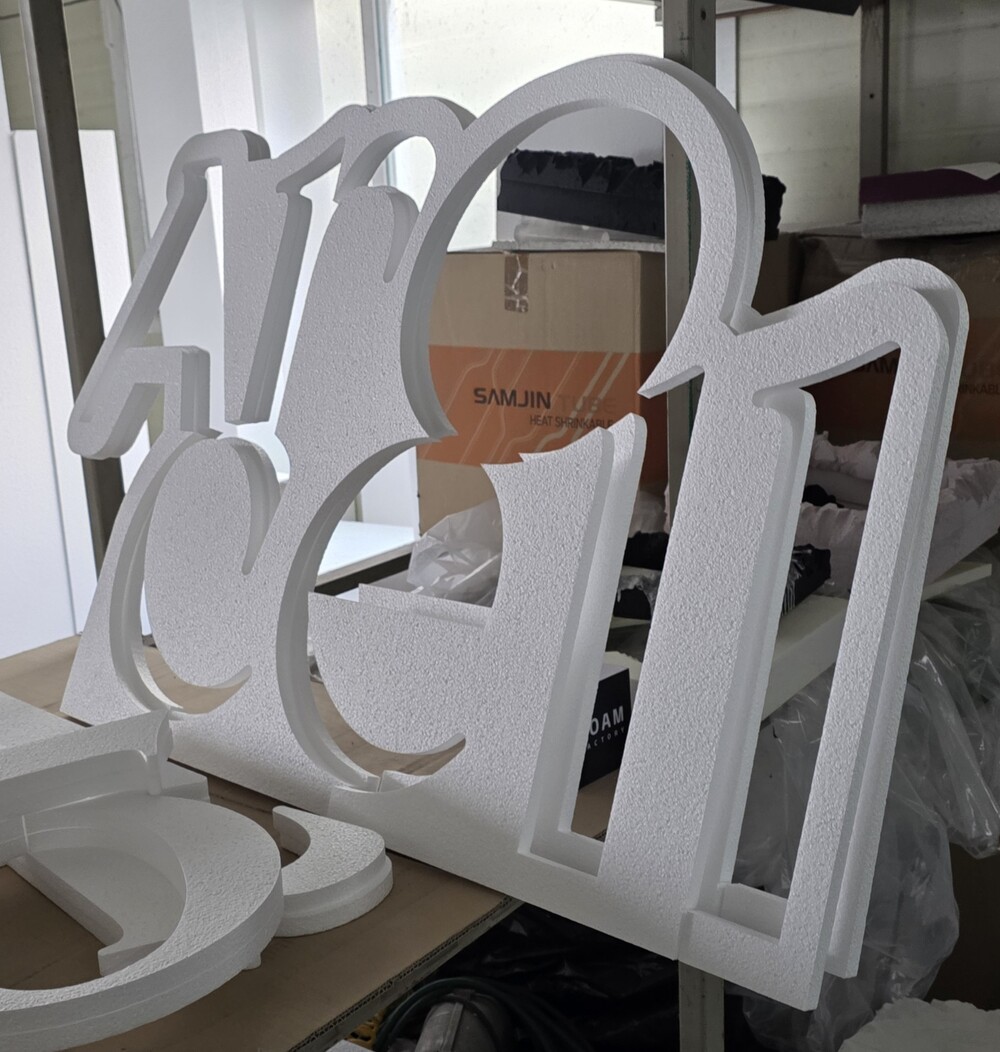 재단 작업에서는 밀도가 높고 표면이 단단한 스티로폼 소재를 사용해 글자 형태를 정밀하게 가공합니다. 장비를 활용해 시안에서 설정한 곡선과 두께를 그대로 구현하여 깔끔한 외형을 만들어냅니다. 기계 재단 방식은 사람이 직접 절단하는 방식보다 오차가 적어 완성도가 높은 것이 특징입니다. 글자의 내부 라인과 외곽 라인이 자연스럽게 이어지도록 세밀한 가공이 이루어집니다. 재단이 완료된 후에는 표면을 정리하여 깨짐이나 거친 부분을 최소화합니다. 이러한 과정을 통해 현장에서 바로 사용할 수 있을 만큼 정돈된 글자 조형물이 완성됩니다.
