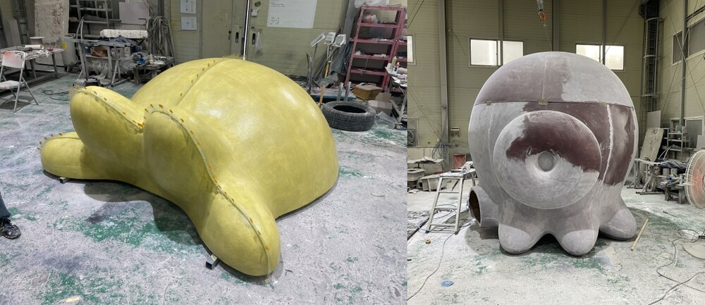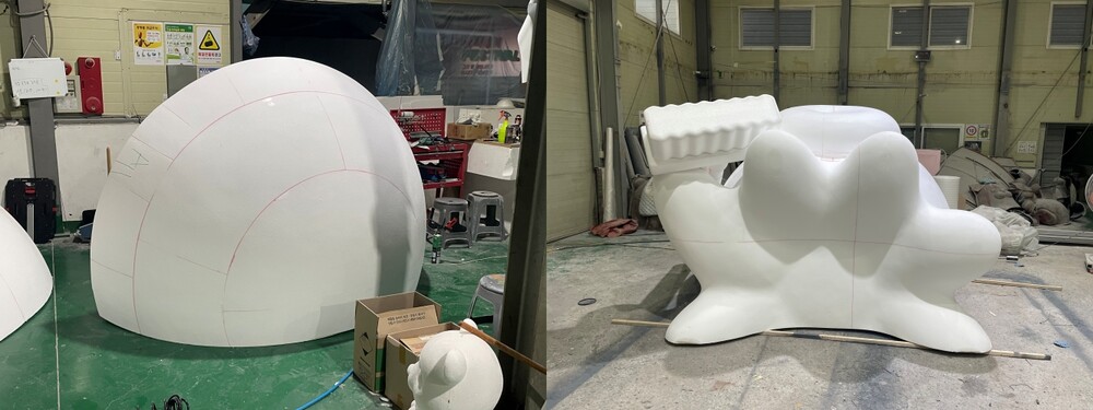 규산 건조가 마무리되면, 조형물 몰드 제작 작업이 시작됩니다. 완성된 몰드는 내부 표면을 깔끔하게 정리한 후, FRP 성형체 제작에 사용됩니다. 조형물 내부에는 안정성을 높이기 위해 파이프 골조를 넣어 구조적 강도를 강화했습니다. 또한 성형체의 표면은 연마 과정을 거쳐 매끄럽게 다듬어, 최종 완성품의 세밀함과 완성도를 높였습니다.
