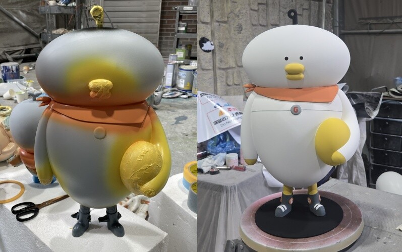 프라이머는 단순한 하도 작업이 아니라 조형물이 오랜 시간 변색이나 들뜸 없이 유지될 수 있도록 하는 중요한 기초 공정입니다. 프라이머 도포가 완료된 후에는 구스 캐릭터의 상징적인 노란색과 화이트 계열을 중심으로 컬러 도색 작업을 진행합니다. 마지막으로 팬톤 컬러 기준 조색과 무광 코팅 마감을 통해 실내 조명에서도 균일하고 안정적인 색감을 유지하도록 완성합니다.