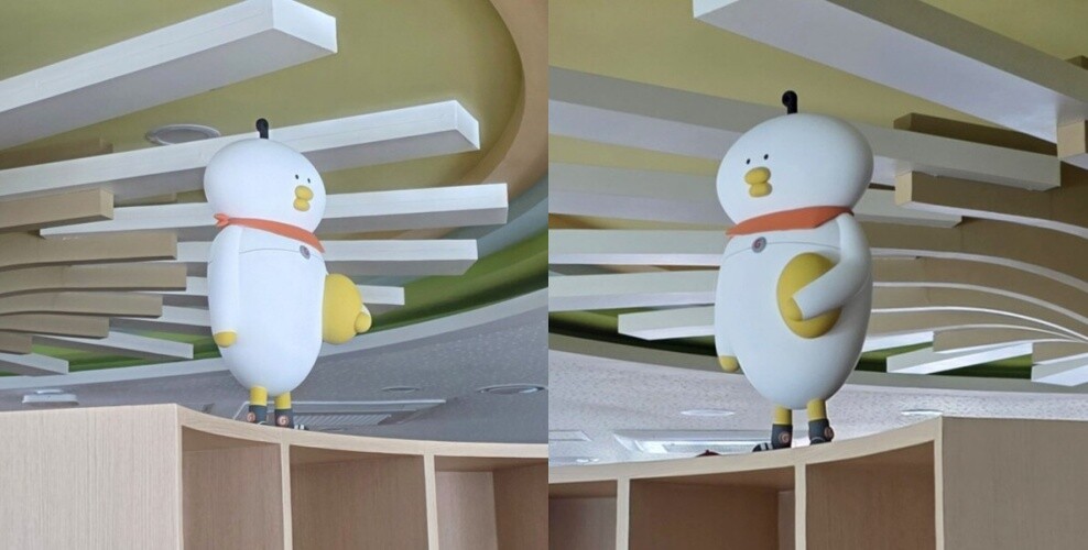 완성된 3D 프린팅 구스 캐릭터 조형물은 운송 과정에서 발생할 수 있는 충격을 방지하기 위해 보호 포장과 고정 장치를 사용하여 안전하게 포장합니다. 이후 구로구청 복합문화타운의 실내 전시 공간으로 조형물을 운송합니다. 현장 설치 시에는 공간의 동선과 방문객의 시야를 고려하여 조형물이 잘 보이는 위치에 배치합니다. 이번 조형물은 방문객들이 입장과 동시에 캐릭터를 마주할 수 있도록 도서관 책장 위에 안정적으로 설치합니다. 또한 시민들이 자연스럽게 사진을 촬영하고 즐길 수 있도록 소형 포토존 형태의 조형물로 완성합니다. 이러한 과정을 통해 지자체 캐릭터를 실제 입체 조형물로 구현하는 3D 프린팅 기술의 활용 가능성을 보여줍니다.
