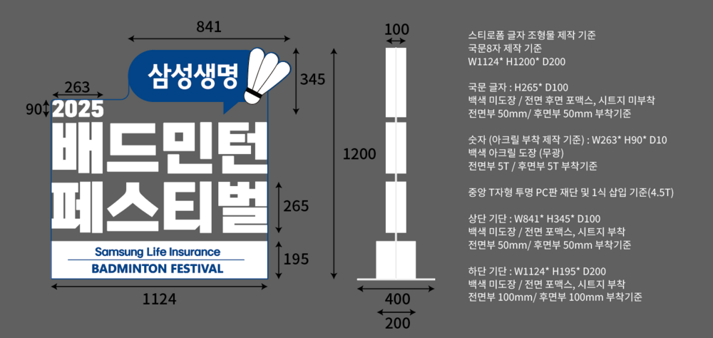 배드민턴 페스티벌 대형 한글 스카시 조형물은 행사 주제에 맞춰 맞춤형 디자인 시안을 바탕으로 제작되었습니다. ‘배드민턴페스티벌’ 문구가 넓은 야외 공간에서도 또렷하게 보이도록 글자의 크기, 두께, 간격 등을 세밀하게 조정했습니다. 또한 단기 행사에 사용되는 구조물임을 고려해 제작 방식과 마감 가능 범위를 사전에 검토하였으며, 시공 시 안정성과 완성도를 높일 수 있는 실현 가능한 설계로 시안 작업이 진행되었습니다.